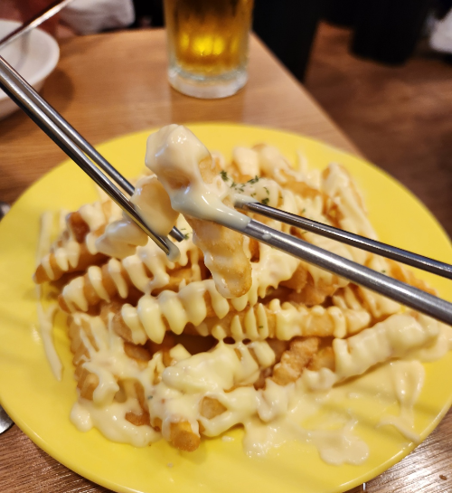맥주+감튀+떡볶이 2인분...양이 많았다.