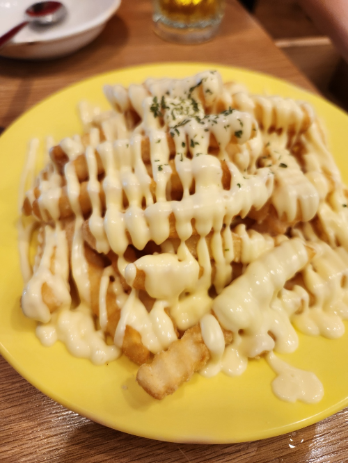 맥주+감튀+떡볶이 2인분...양이 많았다.