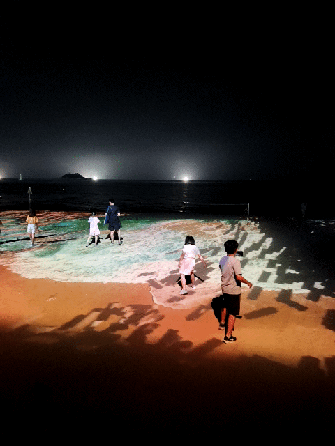 음악과 함께 다양한 영상과 이미지가 모래사장에 비춰지는데, 꽤 색다른 경험이에요.
