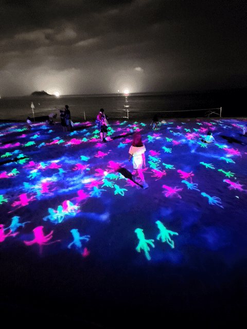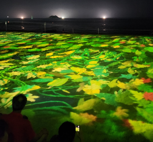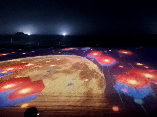 음악과 함께 다양한 영상과 이미지가 모래사장에 비춰지는데, 꽤 색다른 경험이에요.