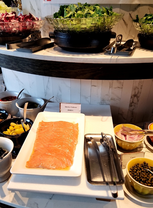 훈제연어를 비롯해 다양한 야채와 드레싱, 햄, 치즈, 견과류, 올리브류가 있었다.