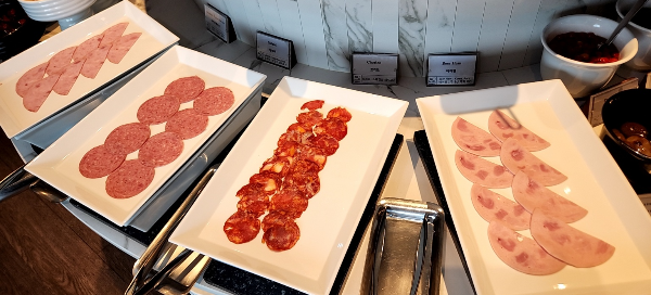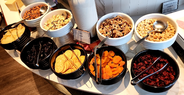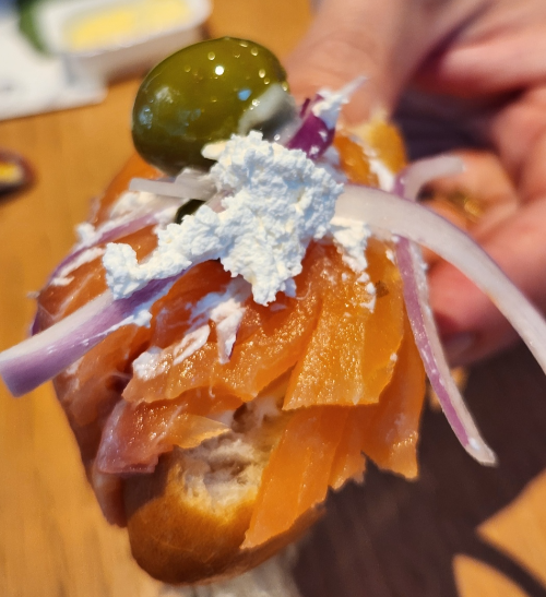 훈제연어를 비롯해 다양한 야채와 드레싱, 햄, 치즈, 견과류, 올리브류가 있었다.