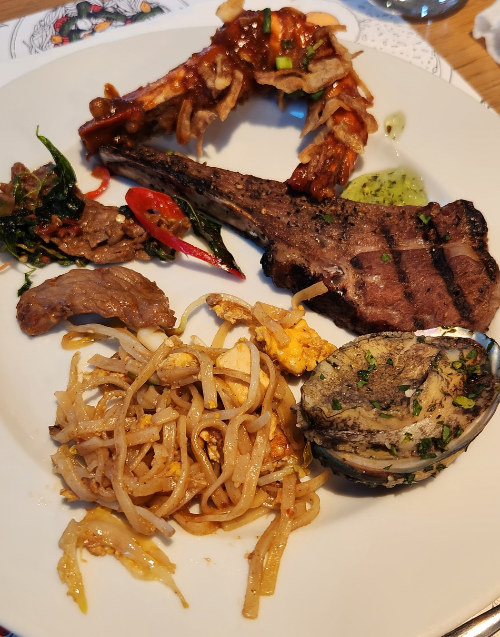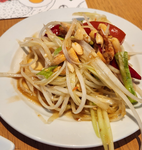 내가 방문했을 때는 태국 음식으로 돼지고기 샐러드, 굴 샐러드, 또 다른 샐러드 2종이 더해져 있었다.