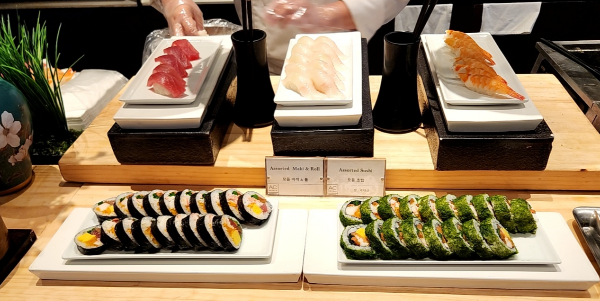 라이브 스테이션에서는 초밥, 사시미, 태국 셰프님이 직접 만들어주는 태국식 돼지갈비 누들, 쏨땀 등이 있었다.