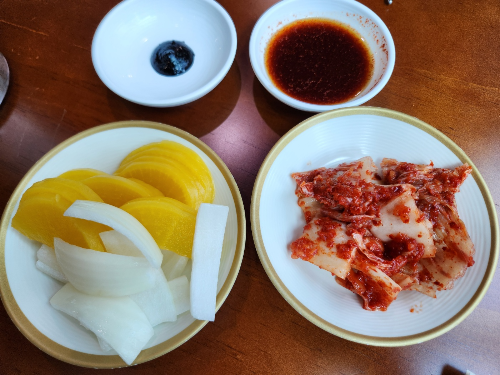 셀프 코너에서 기본 반찬을 가져오며