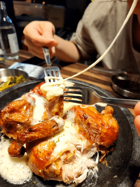 주문하고 조금 기다리니 자글자글 돌판에 통닭 등장!!