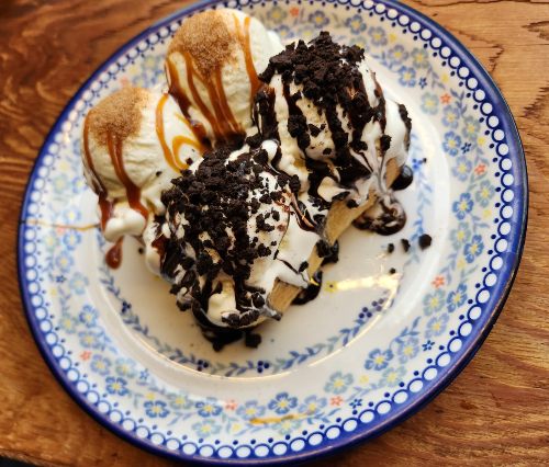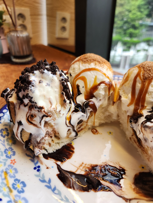 빵 위에 아이스크림이 네 덩이 올라가 있고,