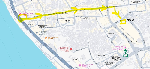 지도로 설명하자면, 해안가 근처 왼쪽 네모 지점에서 출발해서 노란 선을 따라 쭉 걷다 보면—