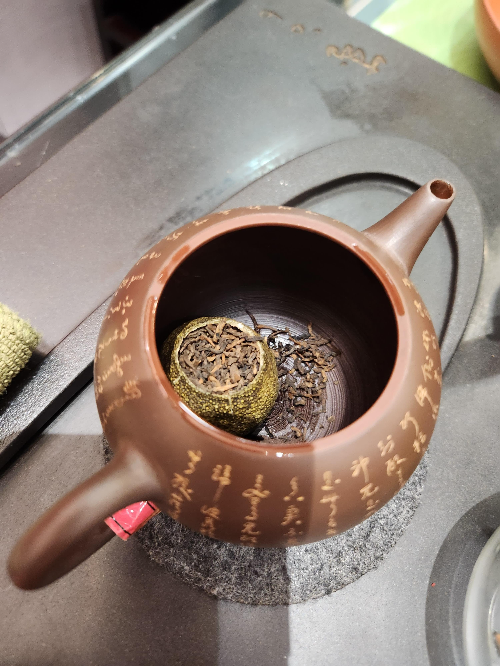 청귤 안을 파내고, 그 안에 보이차를 채워 넣은 건데요—