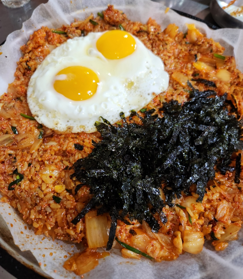 볶음밥 2인분에 김치, 날치알까지 올라간 조합.