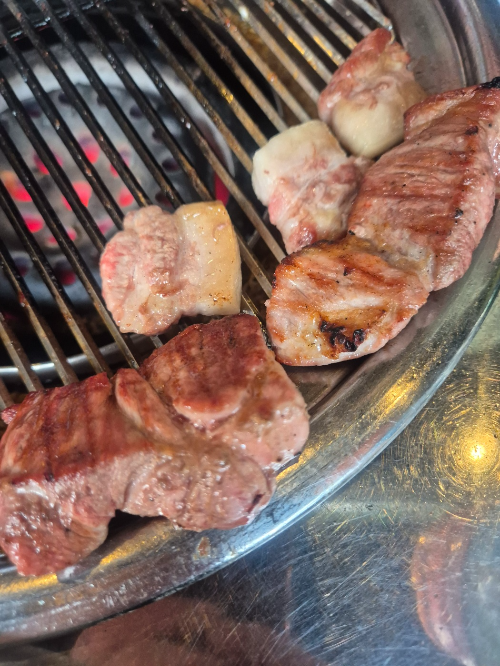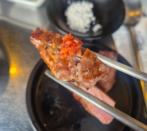 불판 위 고기에 명란젓 한 숟갈 탁.