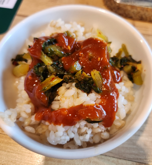 열무김치에 참기름 쓱쓱, 고추장 소스 한 스푼. 그냥 비벼 먹어도 맛이 없을 수가 없어요.