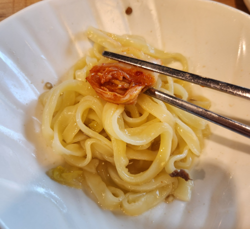 “깔끔한 국물 + 칼국수 + 김치 = 완벽한 마무리 식사”